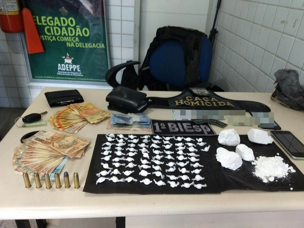 Droga e dinheiro apreendidos com a dupla suspeita de tráfico foram levados para a delegacia (Foto: Polícia Militar/Divulgação)