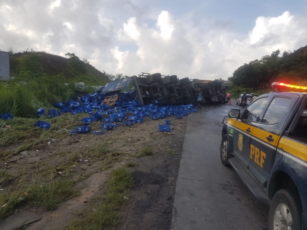 ma carreta que transportava cerveja tombou na rodovia BR-101, no Recife, na madrugada desta segunda-feira (19). De acordo com a Polícia Rodoviária Federal (PRF), o acidente ocorreu no quilômetro 74, por volta das 4h20, e interditou uma das faixas da via, em direção ao Cabo de Santo Agostinho. Parte da carga ficou espalhada e, por isso, os motoristas circulam pelo acostamento.