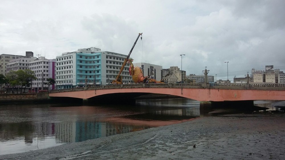 Escultura gigante do Galo é desmontada da Ponte Duarte Coelho, no Recife (Foto: Cláudia Ferreira/G1)