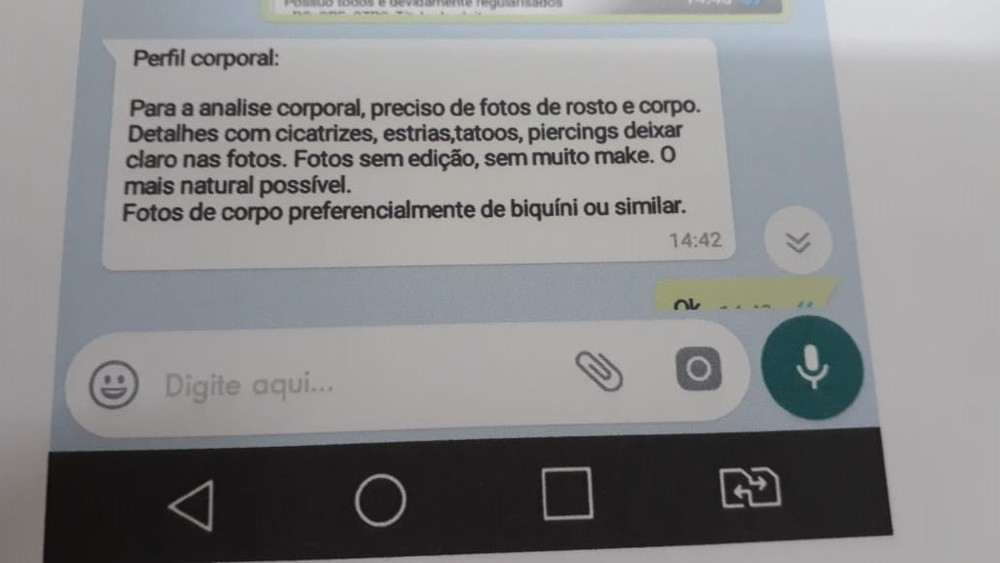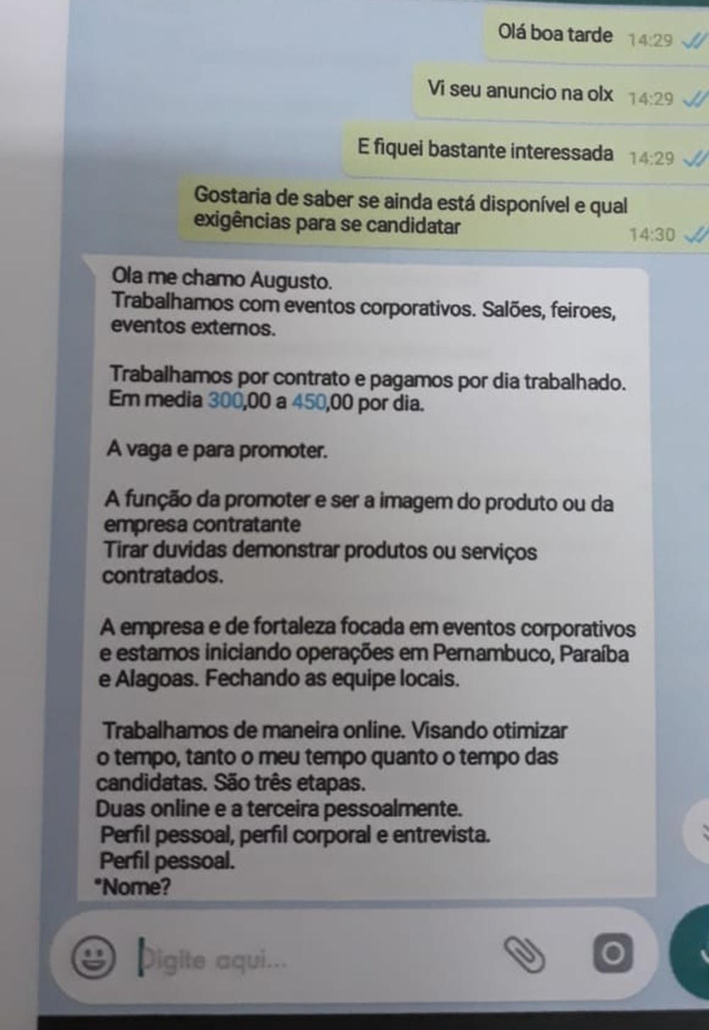Na mensagem, o suspeito explicava as condições da vaga, a remuneração e pedia fotos de biquíni para avaliação corporal. A última etapa da entrevista seria pessoalmente.