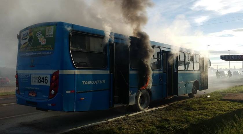 Um ônibus da empresa Taguatur pegou fogo na manhã desta terça-feira (3/4) na BR-070. Por sorte, ninguém se feriu, segundo informações da Polícia Rodoviária Federal (PRF).