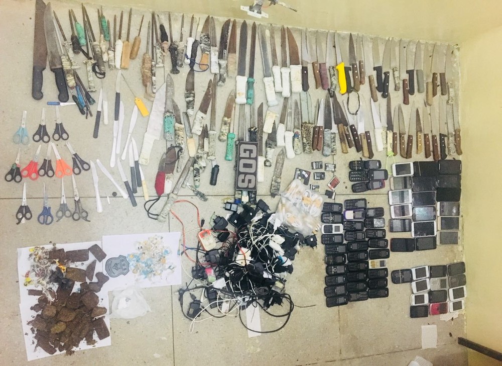 De acordo com a Seres, foram apreendidos um estilete, 91 facas, dois facões, 29 armas artesanais, 12 tesouras, 63 celulares, 57 carregadores, sete baterias de celular, quatro chips, e porções de maconha e crack.