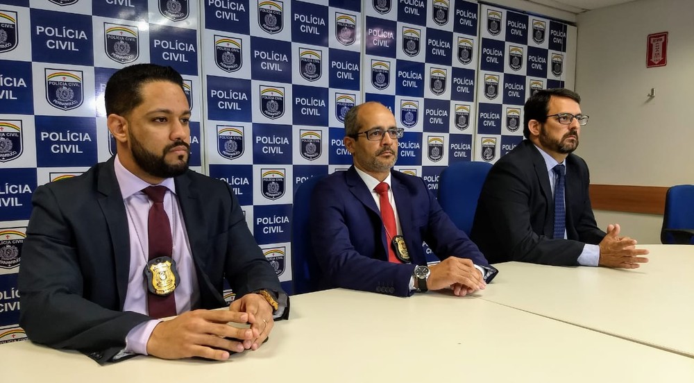Polícia Civil fez coletiva de imprensa nesta segunda-feira (29) para esclarecer prisão de irmãos que davam golpe em site de vendas — Foto: PCPE/Divulgação