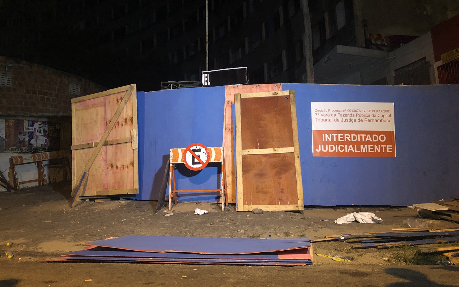 À noite, o entorno do prédio estava quase que completamente cercado por tapumes, com avisos sobre a interdição judicial. Sem eletricidade desde o dia 5 de março, as cores despadronizadas dos apartamentos iluminados nos 17 andares do Holiday, que antes eram características do edifício, deram lugar à escuridão que toma por completo o prédio.