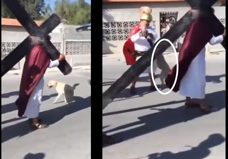 “Cão brincalhão ataca de formas e formas repetidas contra os supostos soldados romanos que atacam e gritam insultos contra Jesus em uma representação da Via Sacra da Semana Santa”.
