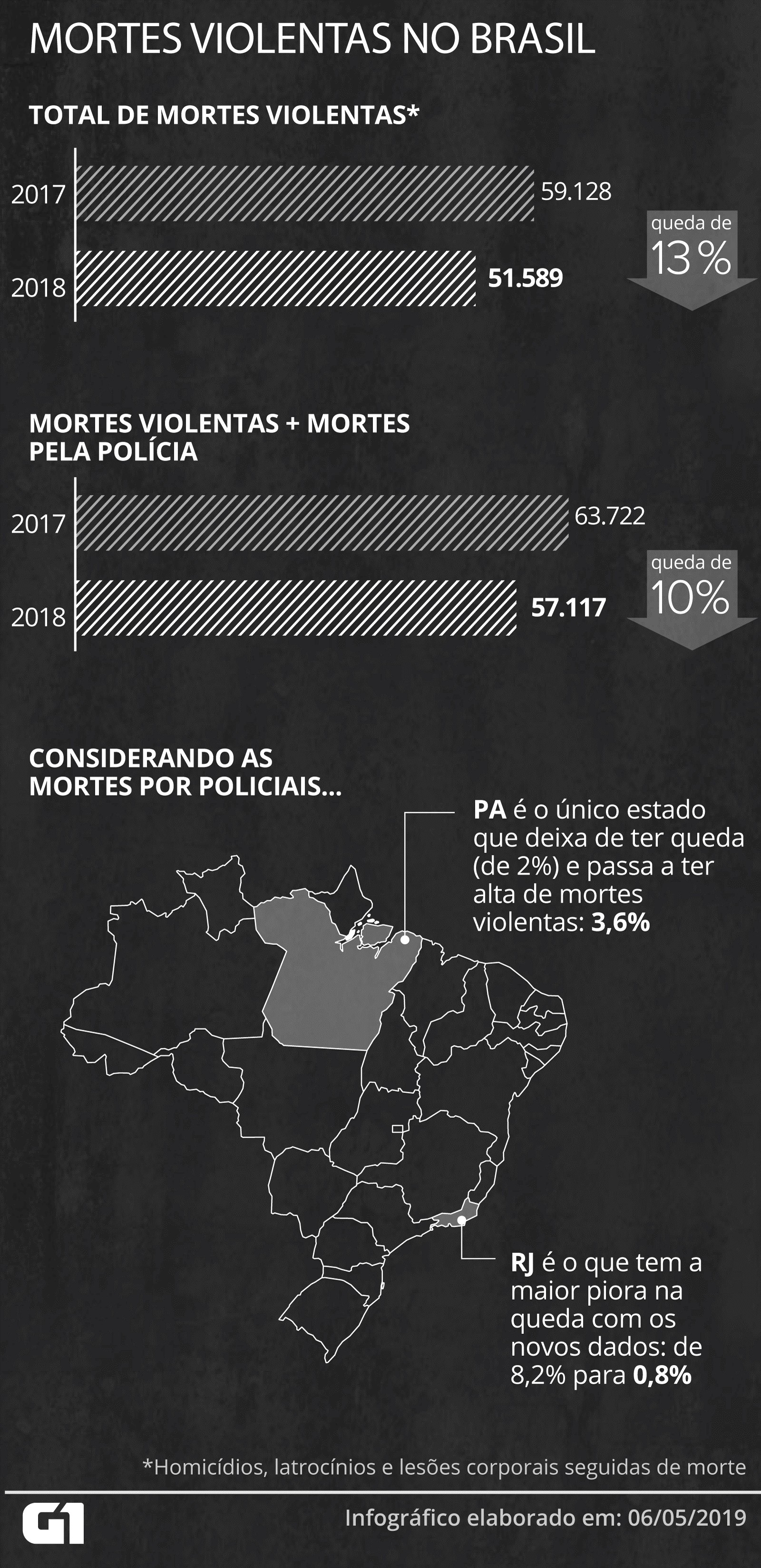 Sem contar as vítimas de intervenção policial, país teve uma redução de 13% nas mortes violentas em relação a 2017. Quando elas são contabilizadas, porém, índice cai para 10%. Com os dados, Pará passa a ter alta no número de mortes e o Rio de Janeiro fica com uma queda próxima a zero.